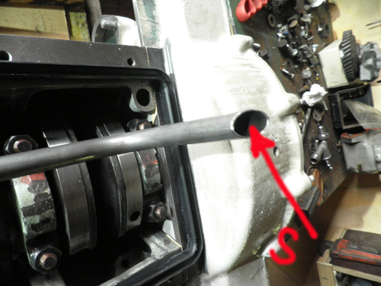 Dann legt man die Dichtung auf die Fläche wo die Ölwanne draufkommt. Am Bild gekennzeichnet mit S das Ölansaugrohr. |