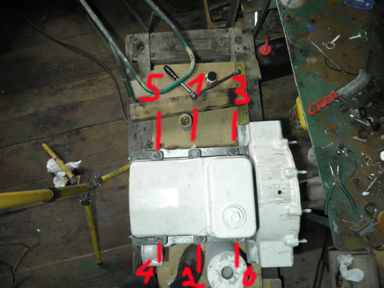 Festzuziehen beginnt man von der Mitte aus immer ein kleines Stück bis sie ganz fest sind . Schraubt man zu viel auf einer Seite kann sich die Ölwanne verziehen . Die Reihenfolge ist am Bild abzulesen . |