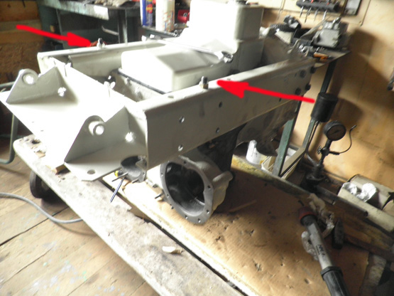 Dann der Rahmen. Hier muss man 2 Schrauben reingeben um das ganze zu Fixieren damit die Löcher wenn der Rahmen hinten festgezogen wird auch passt. Pfeile am Bild. |