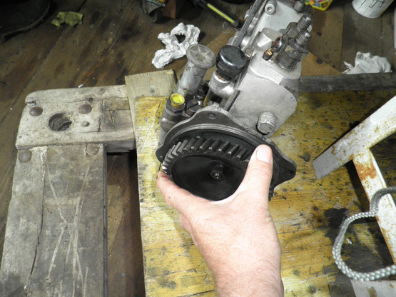 Als nächstes nehmen wir uns die Einspritzpumpe vor. Wenn man an der Pumpe dreht wird man bemerken, dass das Rad Dreiviertel sich leer drehen läßt und beim letzten Viertel es sich anfühlt wie wenn das Rad irgendwo einrastet. |