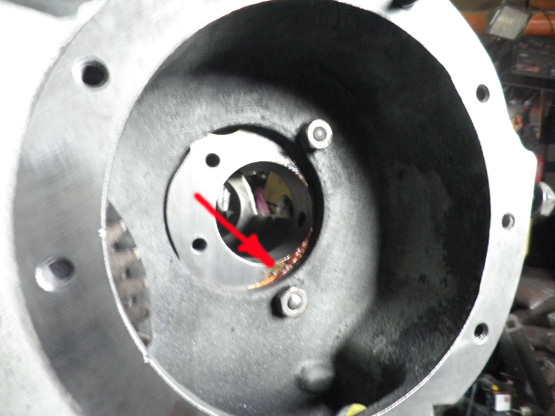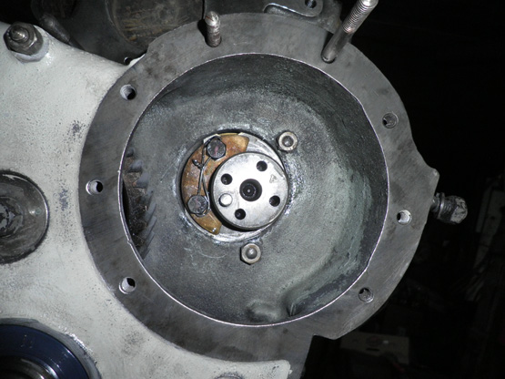 Das nächste ist das Nockenwellenrad . Man muss nur auf die Markierung achten. Am Bild eingezeichnet ein Strich am Zahnrad einer am Gußgehäuse. Man schraubt das Rad mit 2 Schrauben Diagonal rein. |