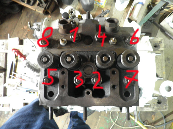 Hier die Reihenfolge in der man die Muttern festzieht. Man sollte die Muttern in 3 Schritten festziehen . Zuerst mit 5 dann mit 10 und dann auf das Endmaß festziehen. Anzugsdrehmoment 16 Kp. dann die Glühkerzen reingeschraubt . |