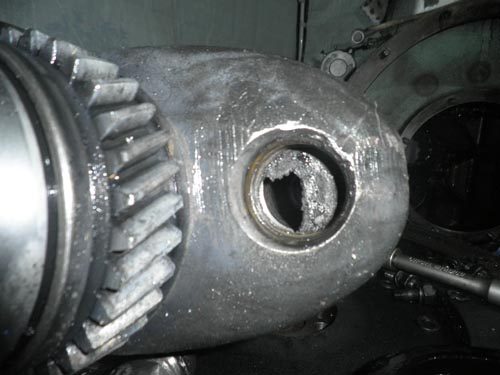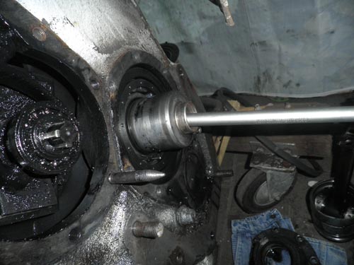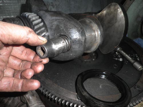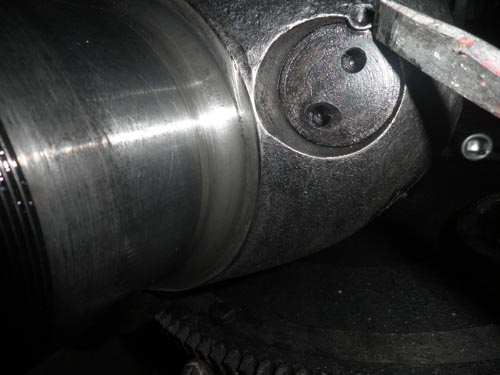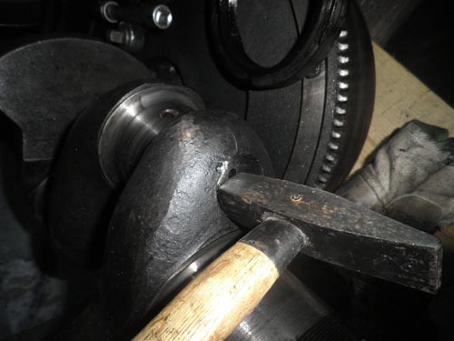 | Die beiden Dinge dienen dazu, dass man die Kurbelwelle leicht ausfädeln kann. Es wird jetzt sein dass man die Welle nicht mit der hand schieben kann , da gibt es dann 2 hilfen entweder man nimmt ein langes Eisen und drückt die Kurbelwelle (entweder von oben durch die Büchsen oder seitlich rein durch die Öffnung zum Kurbelgehäuse )Schwungseitig raus , oder man nimmt eine Welle und steckt sie rein vorne beim großen Gewinde und schlägt dann drauf (wie oben am Bild ) | Wenn man die Kurbelwelle raushebt bemerkt man dass sie sich zur Seite leicht dreht. Dass müssen wir uns merken . Die Drehrichtung und wieviel |