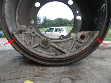 Hier bei dieser Backe sieht man dass der Belag über die ganze Fläche aufliegt . Man hat die größte Ausnutzung des Reibungswiderstandes des Belages. Dies ist eine sehr wichtige masnahme die man unbedingt überprüfen muss. Es gab früher Bremsbackenschleifmaschinen wenn dies nicht genau passte mußte man die Backe einspannen und nachschleifen . Dies war ganz wichtig bei den alten Steyr-LKW's die hatten das gleiche System und hier mußte alles passen . Dieser Arbeitsschritt war sogar vorgeschrieben laut Kundendienstmitteilung vom Werk her |