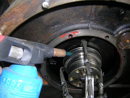 Man setzt einen Abzieher an und erwärmt den Innenring schnell auf einem Punkt. Dann ist das Abziehen problemlos möglich. | |